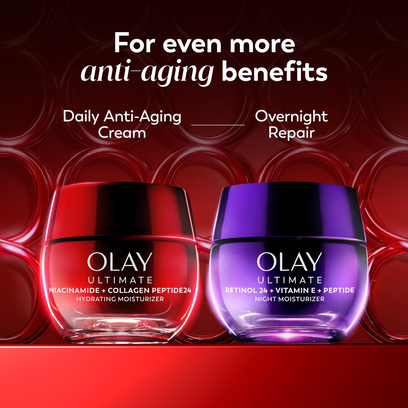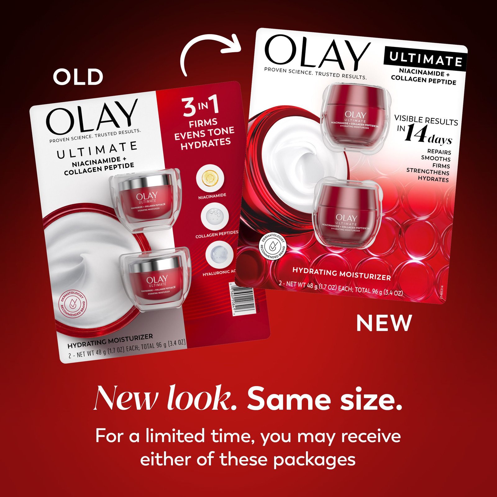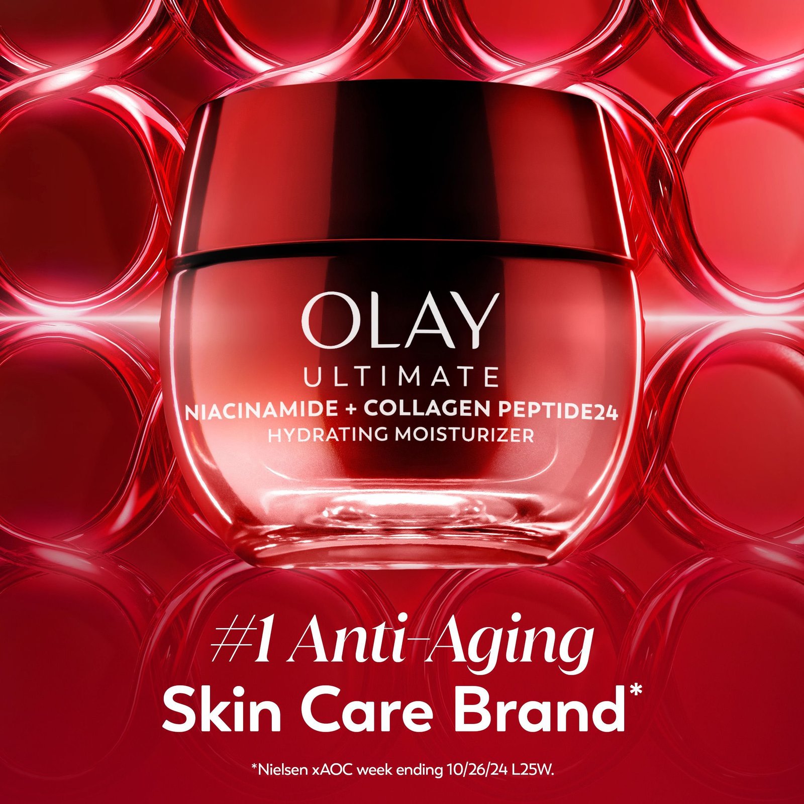 Olay Ultimate Niacinamide + Collagen Peptide24 Face Moisturizer is supercharged for instant visible wrinkle and firming results. It strengthens skin barrier, evens complexion, and visibly corrects wrinkles. It’s crafted by our top scientists with our clinically proven technology, with 99% pure Niacinamide, to improve skin’s moisture barrier for 2x stronger skin*.