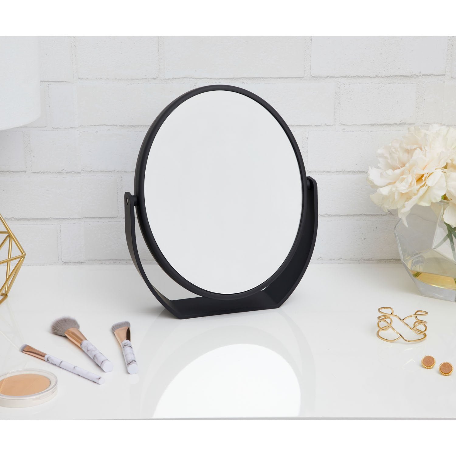 This Oval Vanity Mirror features a sleek matte black finish and a soft-touch rubberized surface, adding a touch of sophistication to any room. Its oval shape and wide base ensure stability, making it a stylish and functional addition to your vanity or countertop.